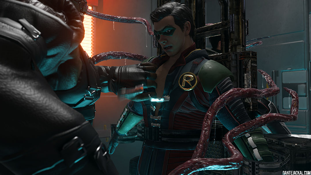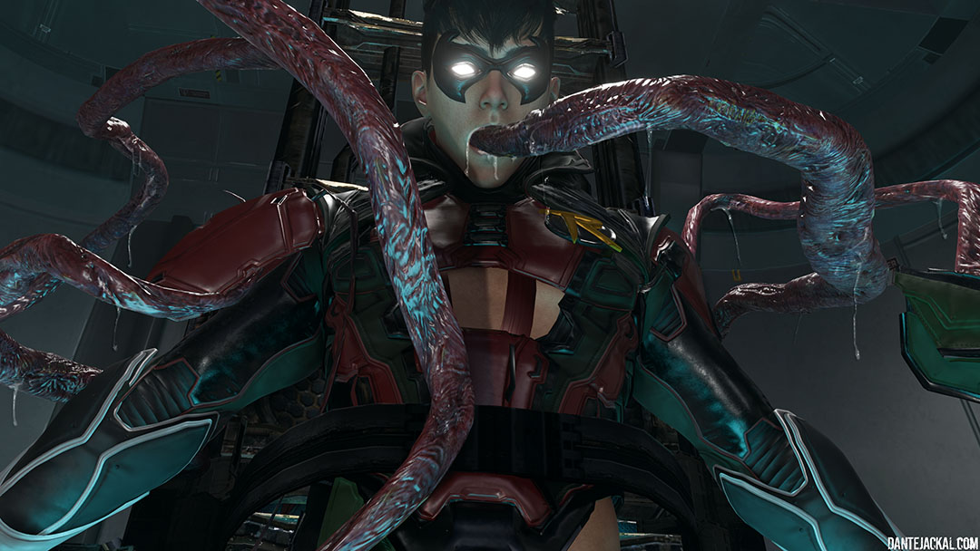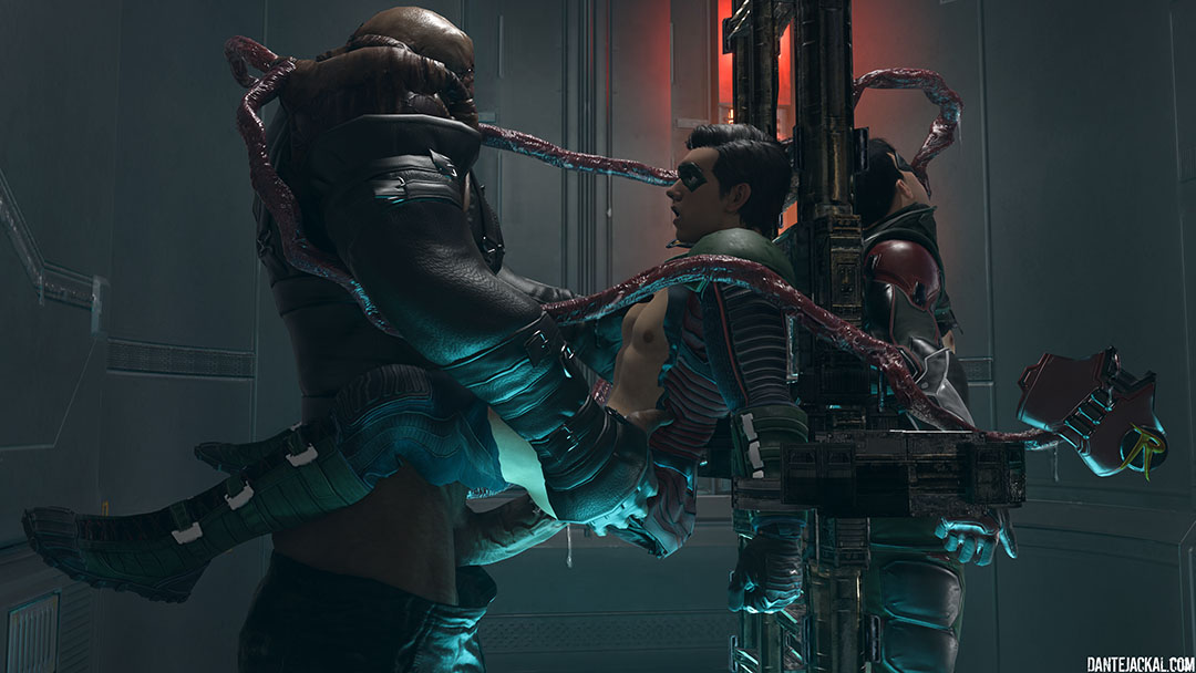 Tim and Damian have been captured by Umbrella, and as they argue with one another as to whose to blame for their predicament, the Nemesis monster appears in their cell! The sight of two strapping hot boys proves too much for the Nemesis' weak resistance, and after some excessive backchat from Damian, Nemesis makes the first move, tearing the Robin out of his suit. Tim isn't free of danger, as Nemesis forces himself into Damian and starts using him for pleasure, the monster's tentacles find their way to Tim, and make light work of unclipping his armor and starts stripping down his suit. The sounds of Damian pleading to stop echoes and as the frame holding them shakes, Tim realises very quickly that Nemesis is pounding his partner! Suddenly Nemesis' roar silences everything. Tim is left nervous as Damian almost blacks out as Nemesis breeds him. Leaving a lasting impression deep inside Damian's broken body, Nemesis still has more to give and his the Tyrant shows Tim what he's missed.... Getting him into position, he shows Tim what happened to Damian first hand and starts pounding. Neither Robin are able to help each other and Nemesis soon lets out a second roar as he unloads into Tim! I'll let you decide which of the two Robins Nemesis enjoyed the most! |